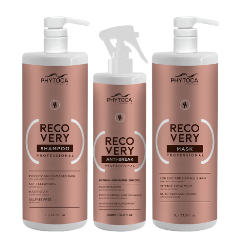 This kit includes Recovery Treatment (1 liter), Recovery Shampoo (1 liter), and Recovery Anti-Break. Its formula is designed to strengthen, repair, and restore elasticity to damaged hair from the first application.