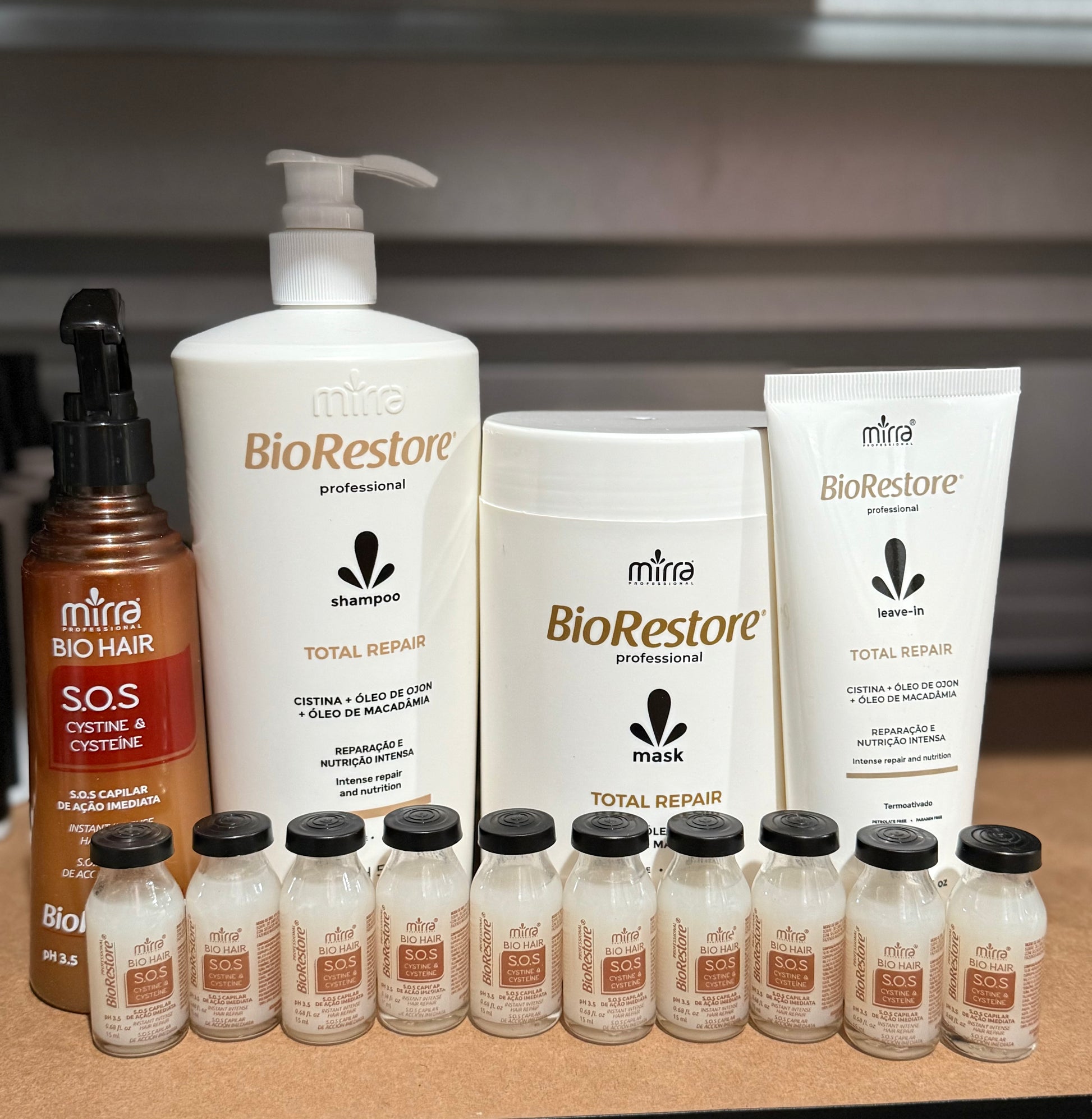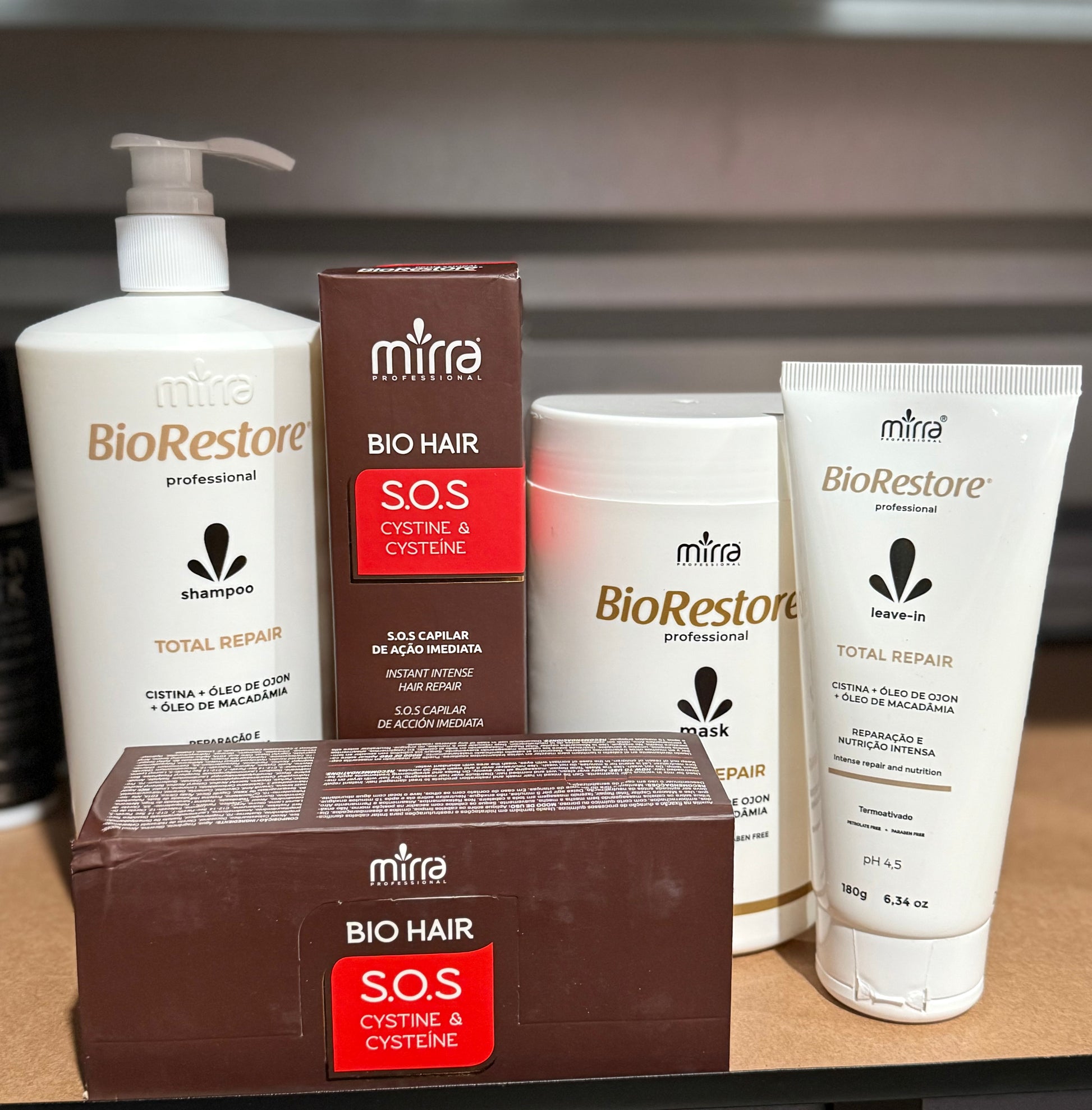 El tratamiento BioRestore Total Repair combinado con el S.O.S Cystine & Cysteine de Mirra Professional es un sistema de reparación profunda e inmediata diseñado especialmente para cabellos decolorados, dañados o sobreprocesados químicamente.