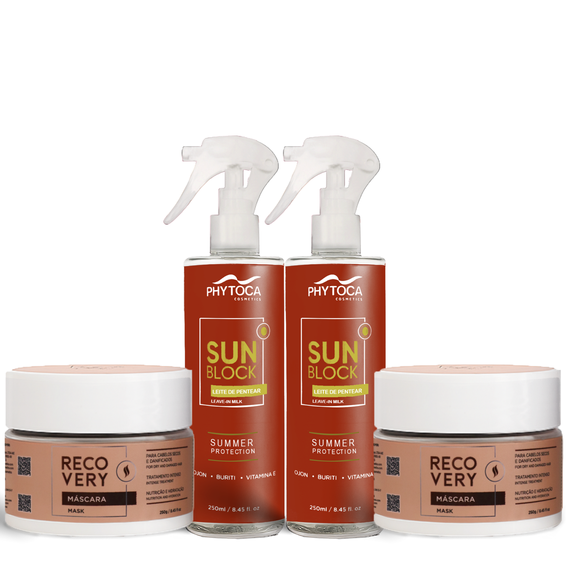 El Kit Recovery Mask Duo & Sun Protection ha sido diseñado para cabello seco, dañado, deshidratado o sometido a decoloración y procesos químicos, que necesita reparación profunda, nutrición intensiva y protección diaria frente a agresiones externas como el sol, el calor, el cloro y el agua salada.